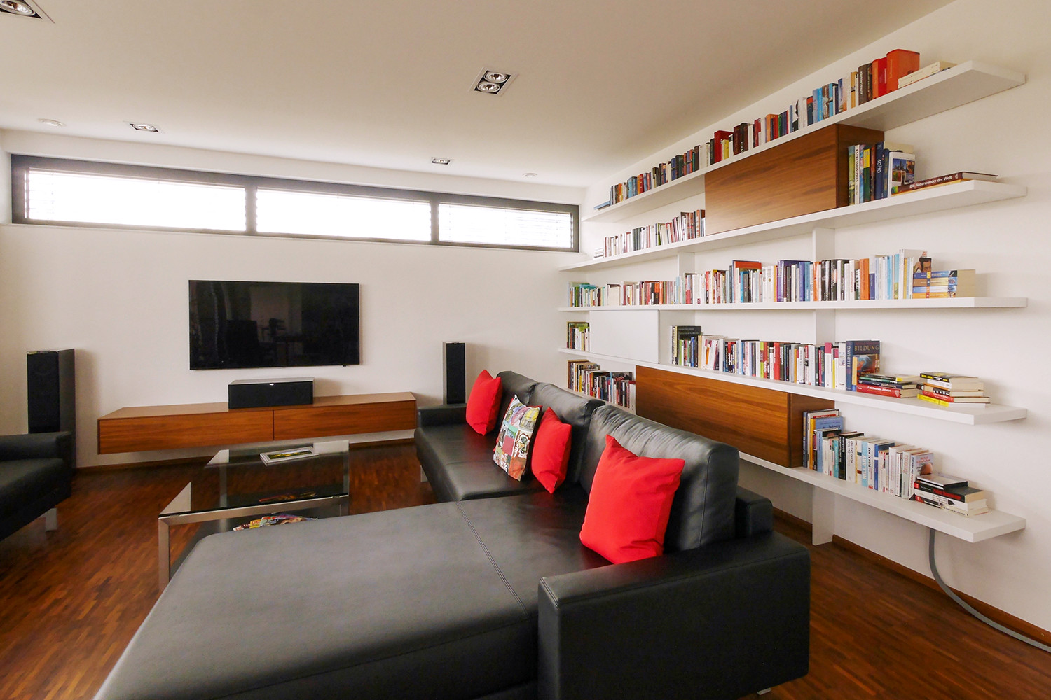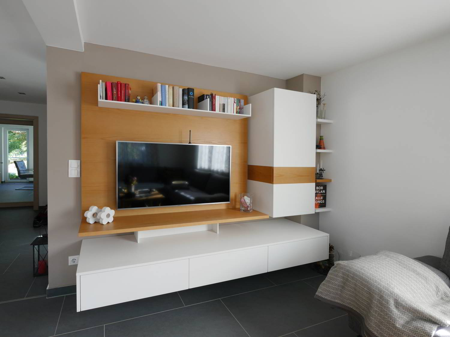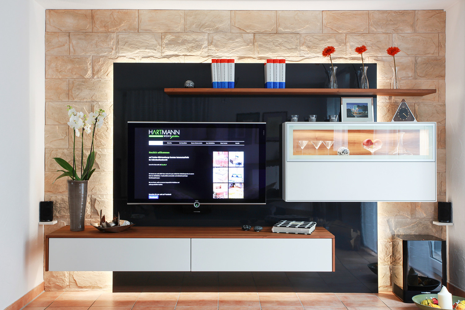 Um für ein stimmiges Raumkonzept in Ihrem Wohnzimmer zu sorgen, schauen wir auf die Anforderungen vor Ort. So spielen beispielsweise die Größe und Position des Fernsehers eine Rolle und Sie können entscheiden, ob sonstige Technik sichtbar oder nicht sichtbar sein soll. Für die Wohnzimmerwand im gemütlichen Teil Ihres Zuhauses bieten wir clevere Schranklösungen.